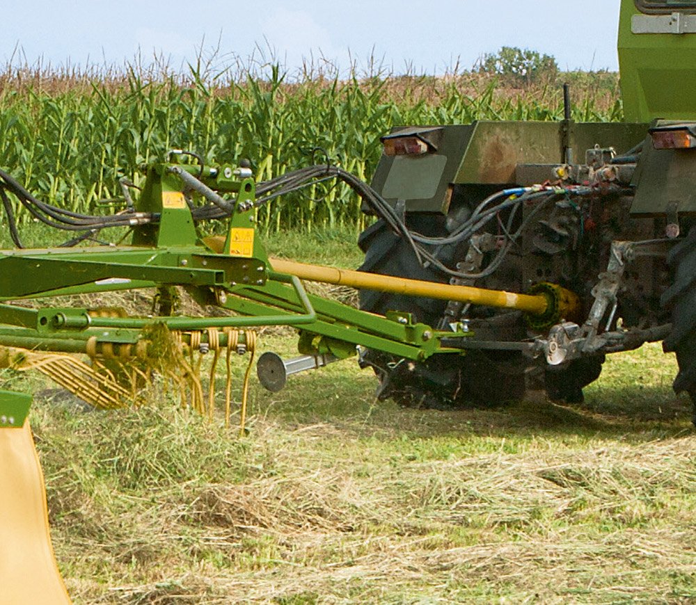 | The cardanic rotor suspension: The rotors pivot in and across the direction of travel to give optimum adaptation to undulating ground. A cardanic joint on the arm with two elongated holes prevents the tines from being pressed into the ground or from being left suspended in the air, thereby avoiding crop contamination as well as throwing the grass about. |