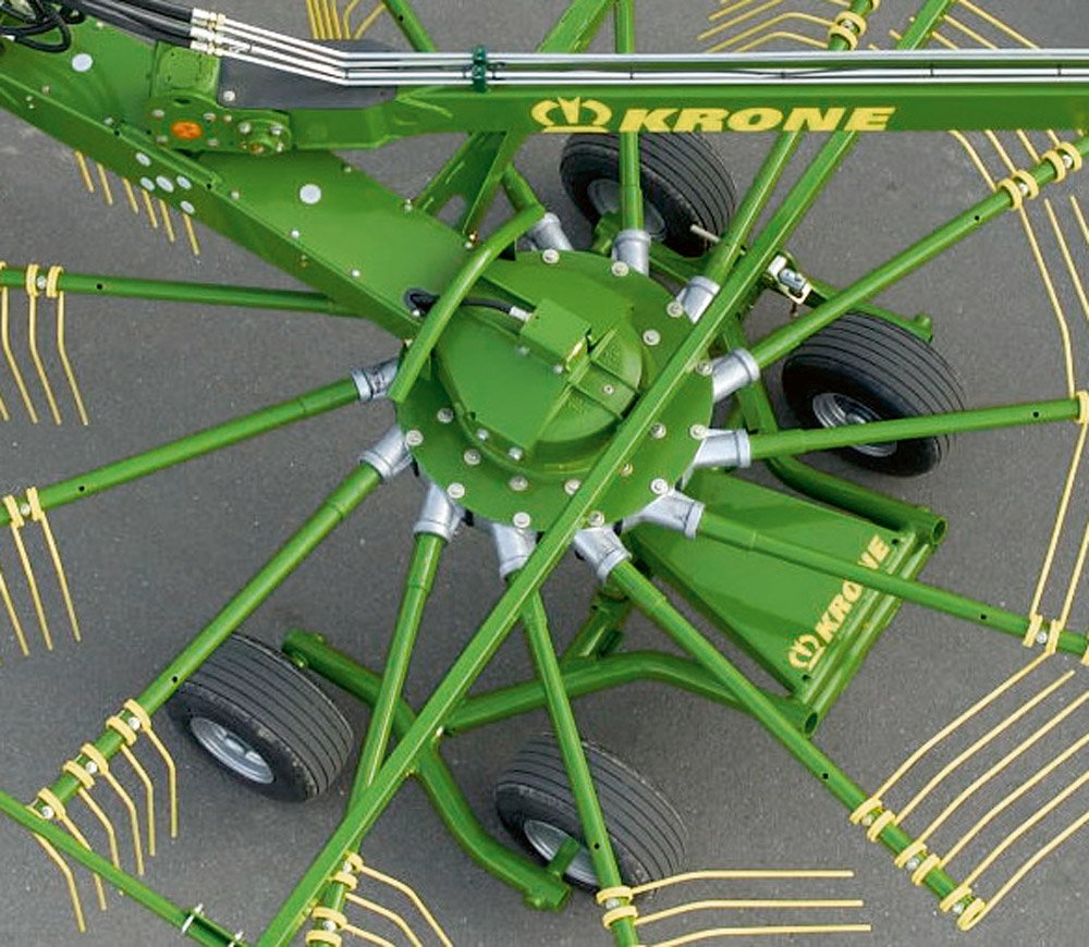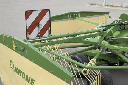 | The central suspension: The rotors suspend centrally across the direction of travel which allows them to produce consistent and high-quality windrows. The special suspension ensures they always stay level as they lift and lower on the headland. In addition, the machine’s weight is distributed uniformly on all wheels of the running gear as it travels down the field. |