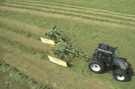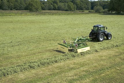 | Double-windrow presentation: Raking up two separate windrows in up and down operation, Swadro TS delivers a maximum work width of up to 15 m (49'3"). Double windrowing is a very effective method to fully exploit the intake capacities of powerful harvest machines. |