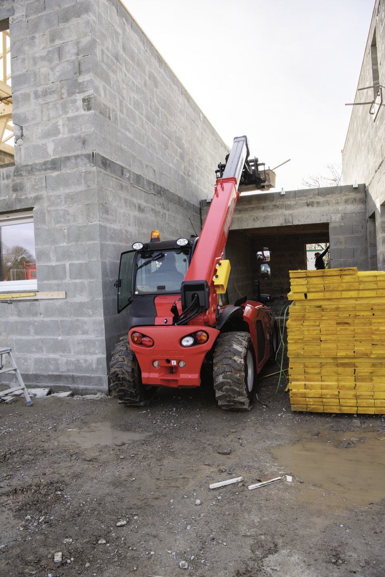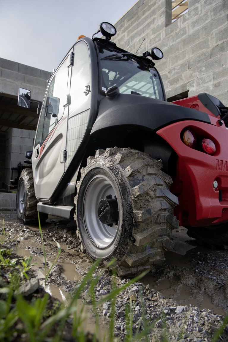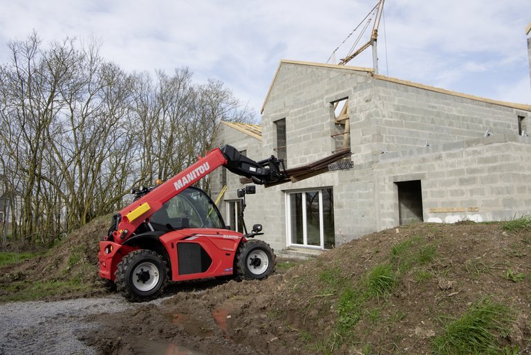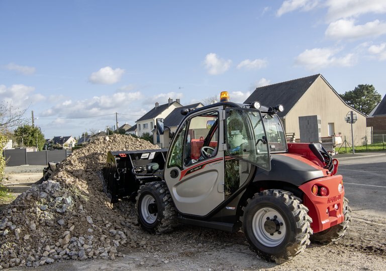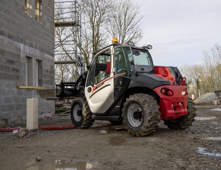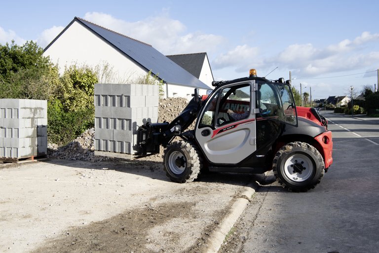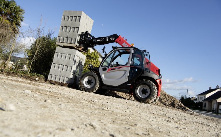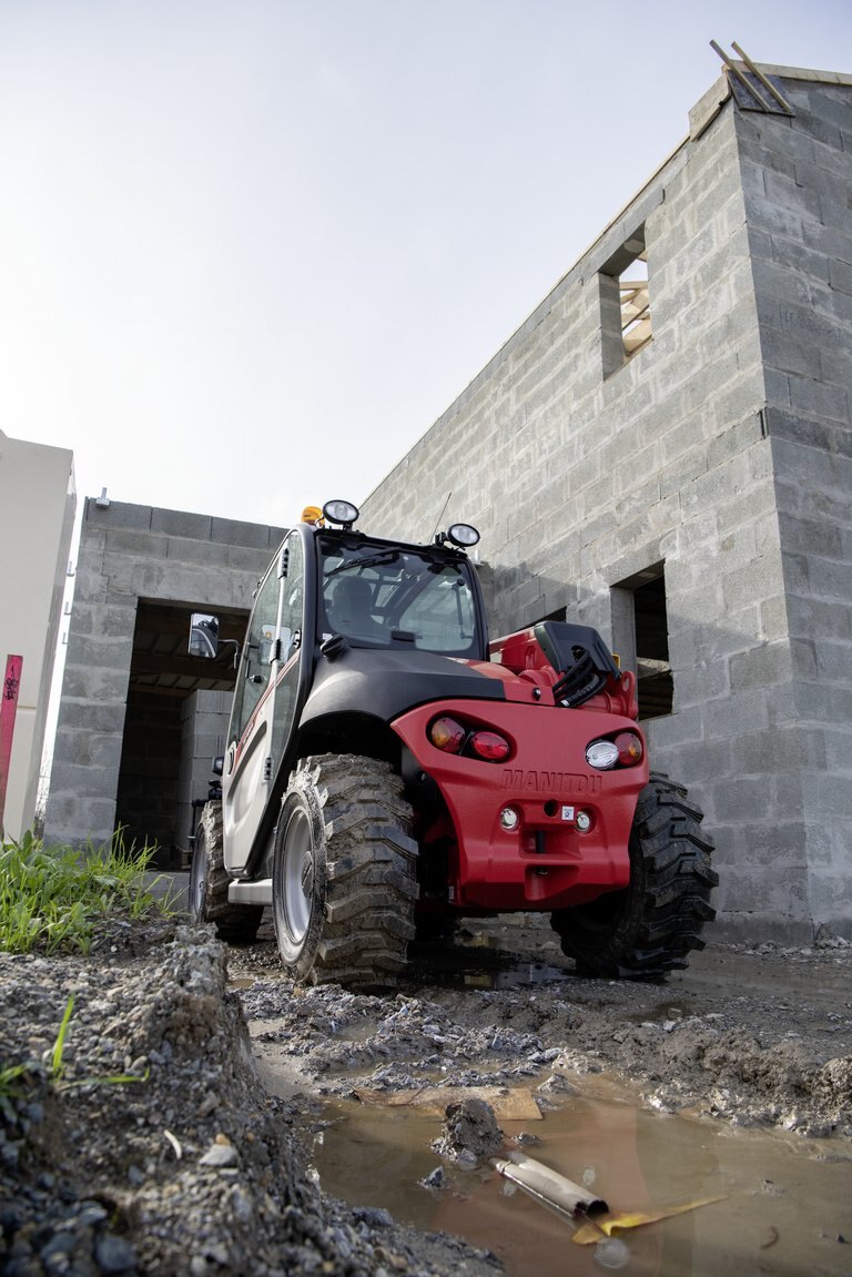 The MT 420 H super-compact telehandler is the smallest in the MT range. Ideal for construction and renovation, its exceptional compactness allows access through narrow entrances as well as confined spaces. Its turning radius and 3 steering modes (4WS/2WS/Crab) provide excellent maneuverability. The MT 420 H has a capacity of 4,400 lbs (2,000 kg) at 14 ft. 3 in. (4.3) m, giving it a high performance load chart. The 56 hp (42 kW) engine and 2-speed hydrostatic transmission has the power to reach 15.5 mph (25 km/h). Another advantage is the simultaneous movements of the lift and extend functions that further increase productivity.